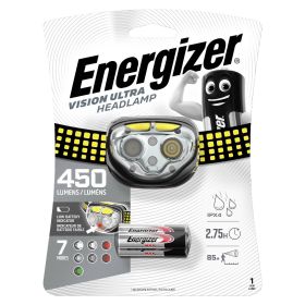 Φακός κεφαλής Energizer Vision Ultra ισχύος 400 Lumens. Λειτουργεί με 3 Μπαταρίες ΑΑΑ. Διαθέτει πρότυπο IPX4 και έχει διάρκεια εως 50 ώρες λειτουργίας, Ορατότητα στα 80 μέτρα. Με ένδειξη χαμηλής μπαταρίας.